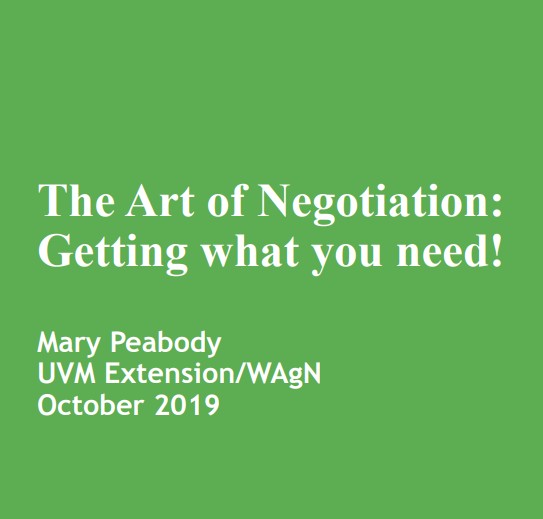 Negotiation is an essential business strategy –whether farm women are negotiating a sales contract, an employment opportunity or want to clarify who is cooking dinner—negotiation is part of every agricultural business owner’s toolkit. But women frequently feel unprepared and unskilled in this form of communication. Following are materials for educators interested in exploring the development of negotiation skills with women farmers and ranchers. Below you will find workshop materials, a recording of a training webinar, and a supplemental worksheet for participants.